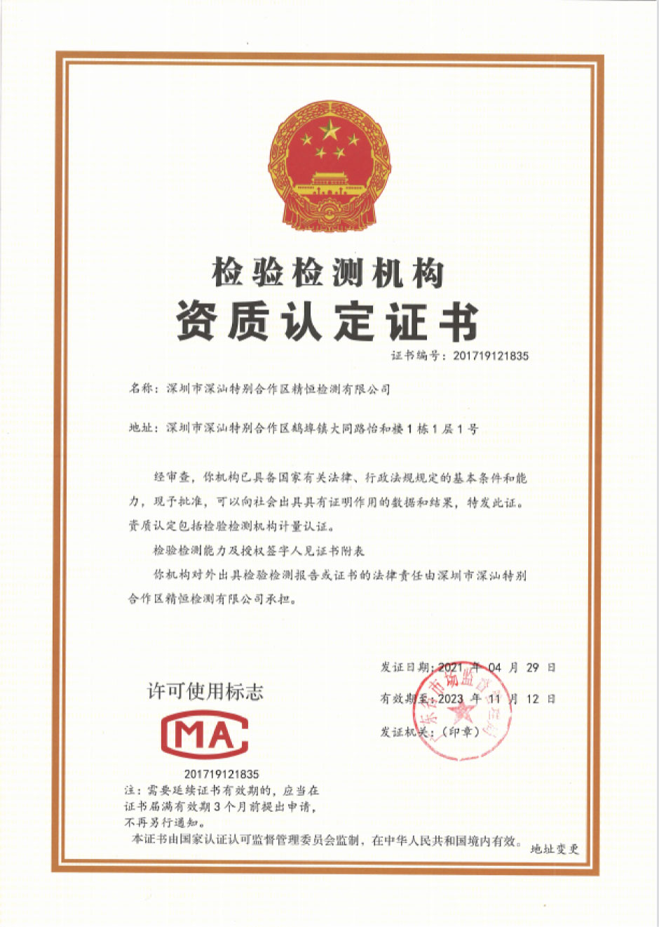 深圳市深汕特别合作区精恒检测有限公司前身为深汕特别合作区精恒工程检验有限公司,由云开平台控股投资,于二零一四年十二月在汕尾市住房和城乡建设局备案(证书号:JCJG-2015003),从事检验检测工作,二零一五年深汕特别合作区招商引资,为了更好的服务于深汕特别合作区,方便于建设管理者严把建设工程质量关。根据国家相关法律、法规要求,当地也必须有国家认可的检验检测机构,作为一个深圳市检测经验丰富的检测机构,经汕尾市政府、深汕特别合作区管理委员会等领导审批后,作为第二批进驻深汕特别合作区企业。由于建设发展的需要,本公司于二零二一年十月二十七日更名为深圳市深汕特别合作区精恒检测有限公司。