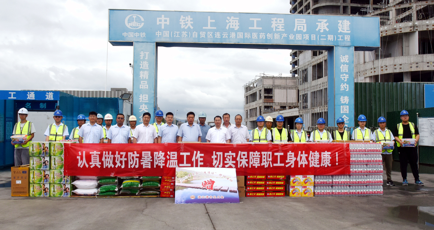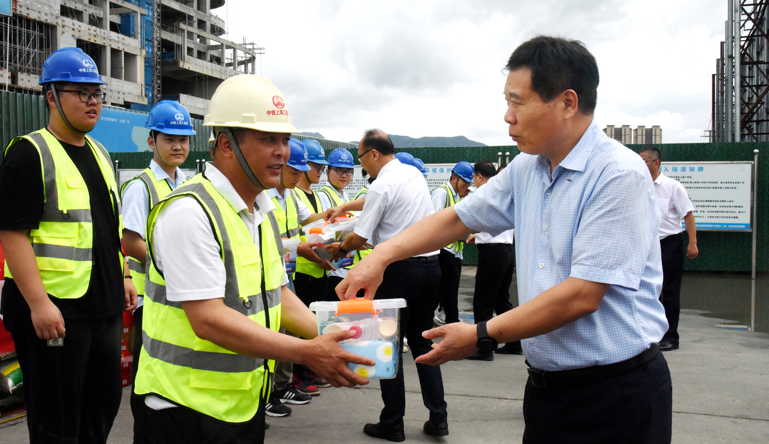 7月28日,市总工会党组书记、副主席丁维杰带领市总工会相关部门负责人一行,在云开平台公司党委副书记、工会主席戴鸿鸣的陪同下,看望慰问奋战在市重大项目一线的建设者,并送上防暑急救箱等慰问品。 在云开平台公司国际医药创新产业园二期项目工地,丁维杰与职工们亲切交谈,详细了解生产生活情况,向顶高温、冒酷暑,坚守在岗位的工程项目建设者们致以崇高的敬意和亲切的问候,希望他们在坚守岗位的同时,增强自我保护意识,做好防暑降温工作。同时督促建设单位要贯彻落实防暑降温政策措施,增设防暑降温设施,保障项目建设一线劳动者的人身安全和身体健康。