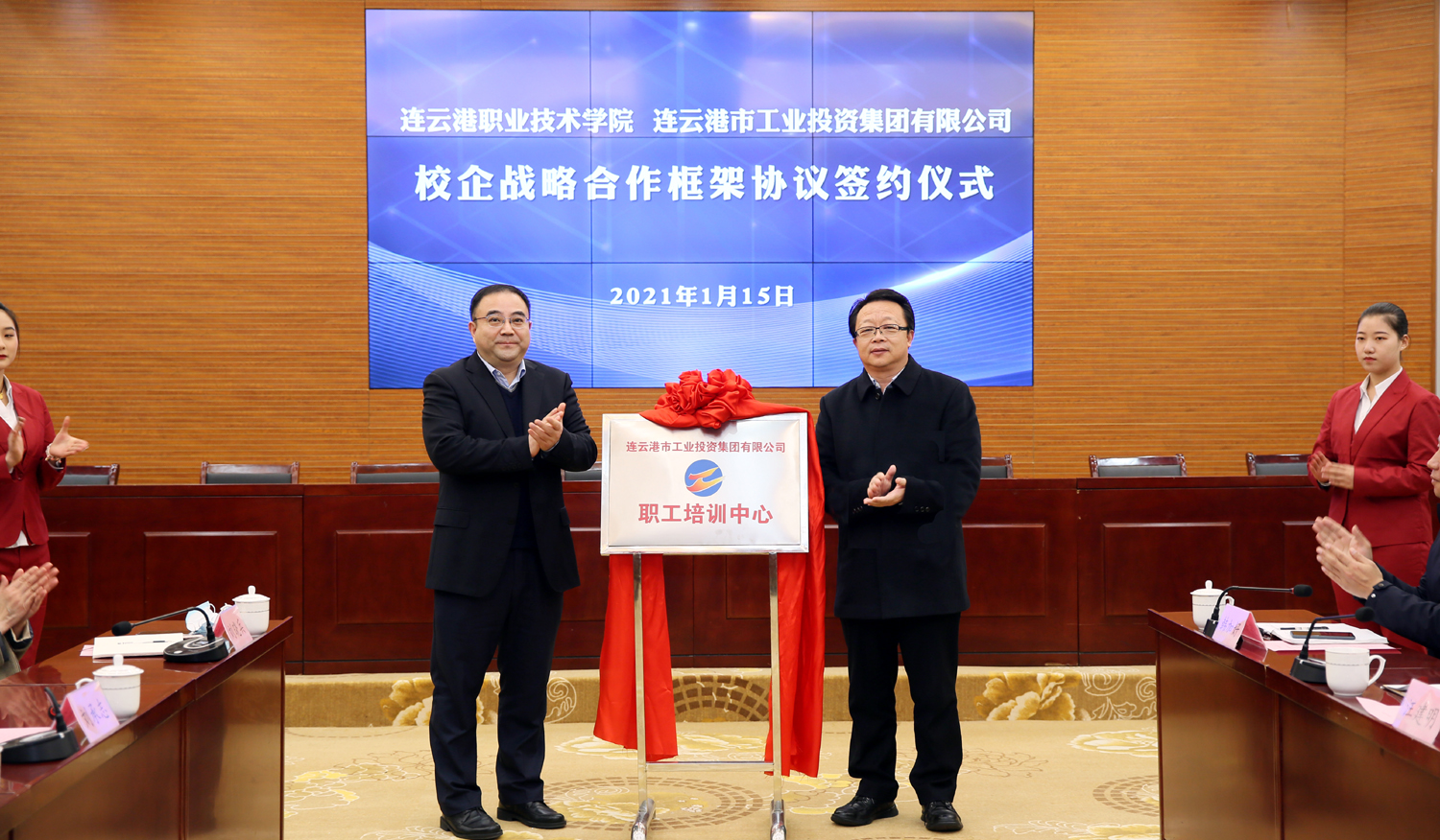 为深入推进产业工人队伍建设改革,搭建职工教育培训平台,1月15日,在连云港职业技术学院举行校企合作签约仪式,并为云开平台公司职工培训中心揭牌。云开平台公司党委书记、董事长杨龙,工会主席刘承志,总经济师陈如军;连云港职业技术学院党委副书记、校长骆汝九,副校长葛仁福、汪建明等领导出席活动。 骆汝九致欢迎辞,表示通过合作办学、合作育人、合作发展,构建优势互补、资源共享、互惠双赢、共同发展的新格局,推动高等职业教育与经济社会同步发展,全面开启校企战略合作的美好未来。