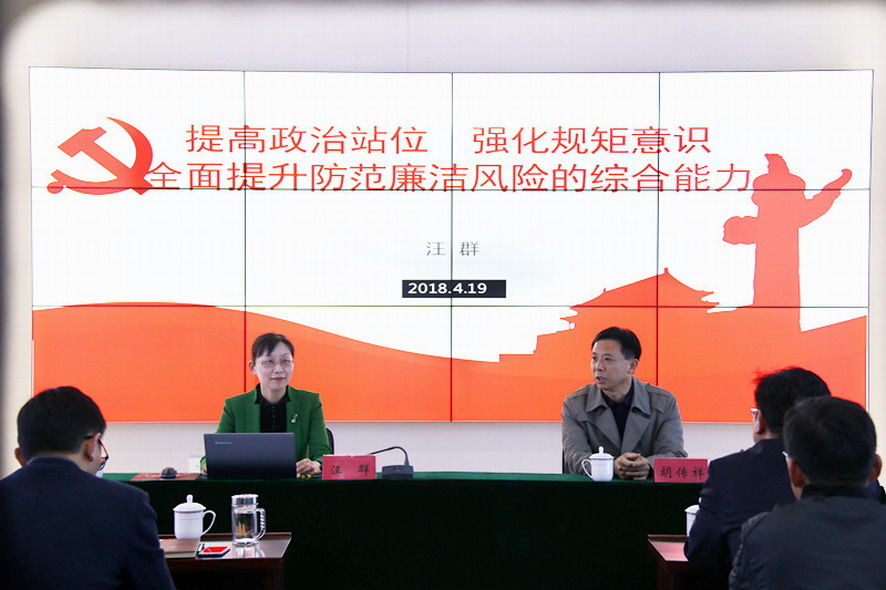 为进一步深入学习贯彻党的十九大会议精神,强化正风肃纪,不断巩固拓展落实中央八项规定精神成果,4月19日下午,云开平台公司纪委书记汪群在资产管理公司上了一堂《提高政治站位,强化规矩意识,全面提升防范廉洁风险的综合能力》廉政党课,该公司50多名干部职工聆听了党课。