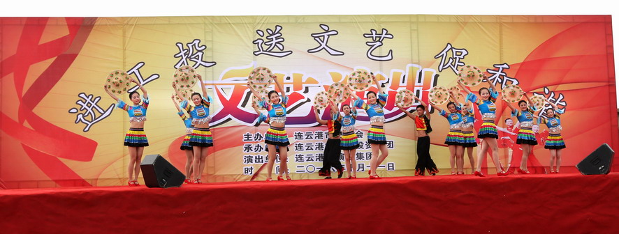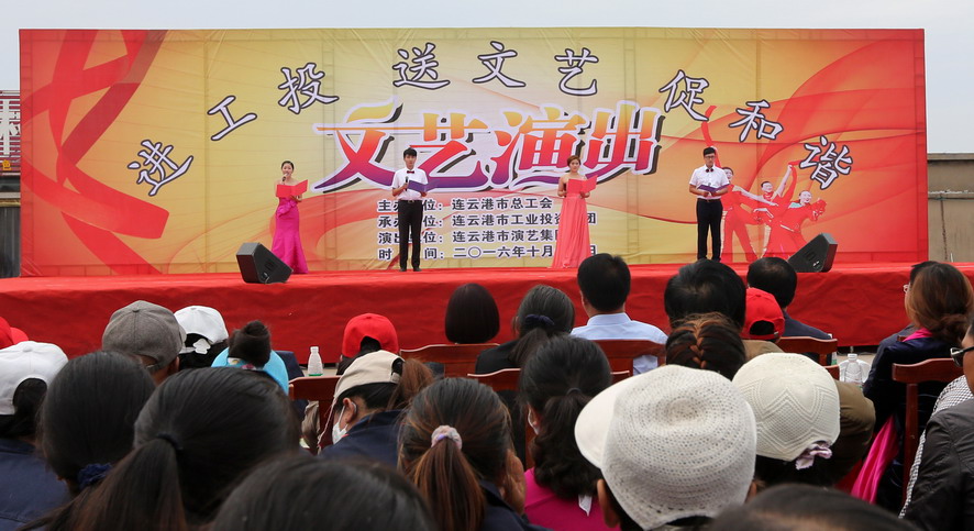 10月11日下午,由连云港市总工会主办、云开平台公司承办、市演艺云开平台演出的“进工投、送文艺、促和谐”文艺演出在灌西投资公司精彩上演,市总工会副主席陈健、云开平台公司工会主席戴鸿鸣等领导,以及1000余名观众观看了演出。