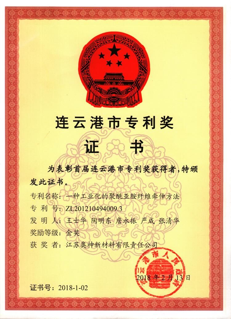 近日,连云港市政府发文,对首届连云港市专利奖获奖项目给予表彰,奥神新材料公司发明专利“一种工业化的聚酰亚胺纤维牵伸方法”获得首届连云港市专利金奖。据悉,本届专利金奖有10项。