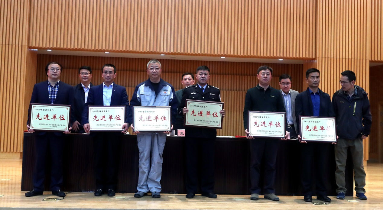 2018年4月28日,开发区2017年度安全生产会议在新海连大厦召开。会上对18家“安全生产先进单位”和26名“安全生产先进个人”进行了表彰。我公司荣获2017年度开发区“安全生产先进单位”荣誉称号。(氨纶宣)