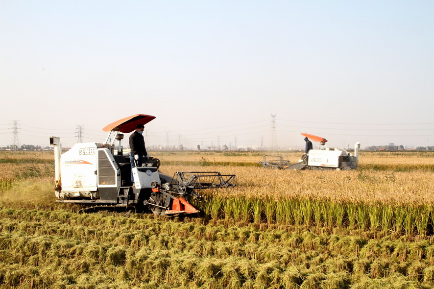 11月1日下午,连阴后地放睛气温明显回升,盐田稻花香,稻谷归晒场,销售订单忙。在青口公司大新农场的一分场赵斯凯的条田,两台收割机来回穿梭,一片繁忙的景象,全公司近二万亩水稻开始收割。