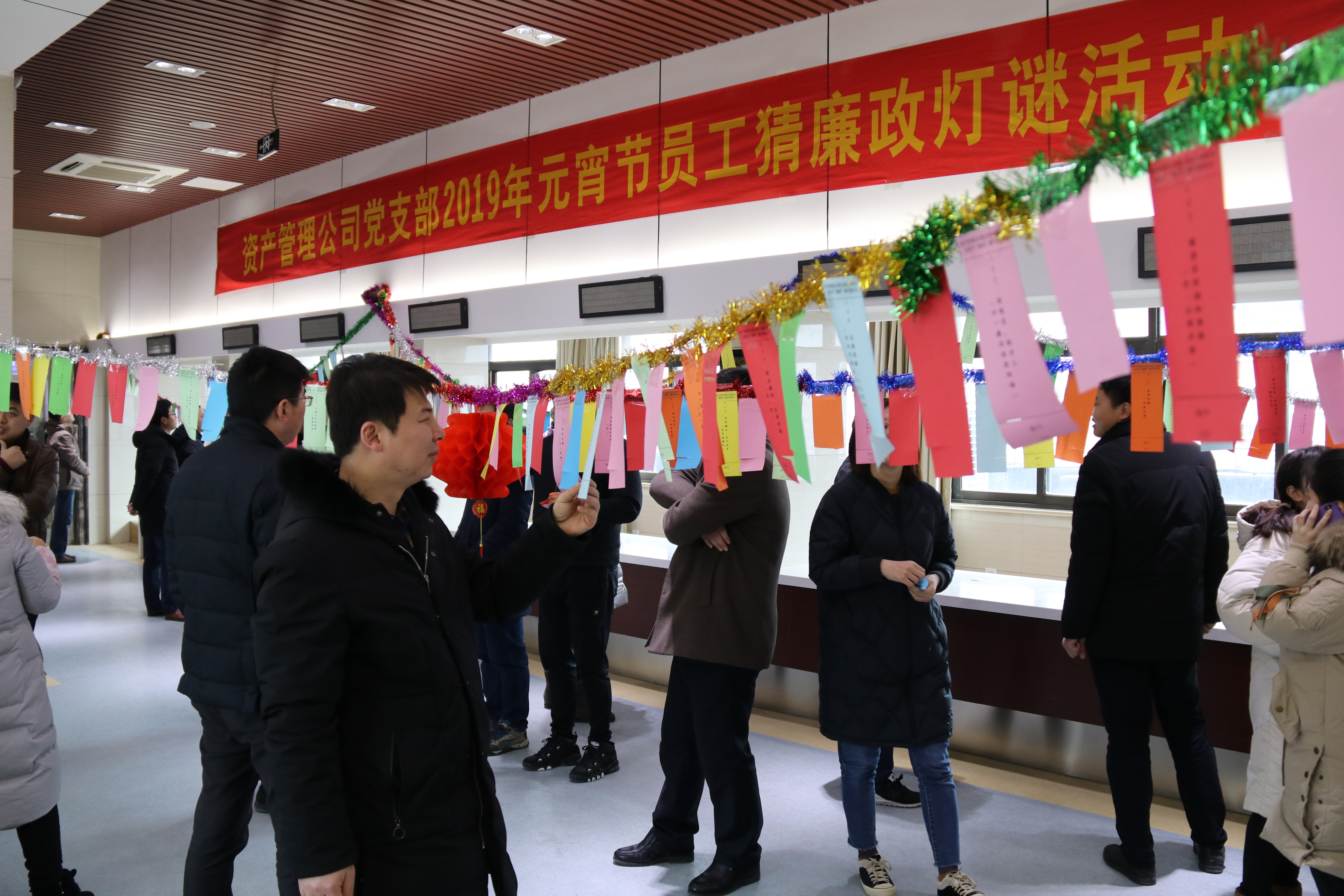 为弘扬传统文化,丰富员工文化生活,营造文明和谐、健康向上的文化氛围,让员工在体验文化魅力的过程中度过一个温馨、愉悦、祥和的元宵佳节。219日,资产管理公司党支部以“树文明新风、倡廉洁文化”为主题,举办2019年元宵节猜廉政灯谜活动,在欢度佳节的同时,“触摸”廉政文化、接受廉洁教育。