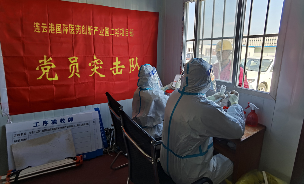 “请大家保持一米线,戴好口罩,有序参与核酸检测,谢谢配合!”来自市级重大项目连云港国际医药创新产业园二期项目党员突击队的成员席时栋、陈家辉喊道。据悉,该项目目前按照上级相关规定,实行闭环管理,做好相关疫情防控工作。“我们项目部严格按照市、开发区相关规定,做好闭环施工,疫情防控、项目建设两手抓、两手硬。”来自云开平台棚户区改造裕源三期项目负责人青年党员徐震说道。