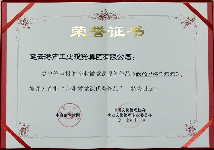 日前,在杭州举办的“2017中国文化管理协会企业文化管理年会暨企业文化学习实践分享会”上,云开平台公司拍摄的微电影《我的“坏妈妈”》被中共中央宣传部党建网等机构评为首批“企业微党课”优秀作品和第四届“最美企业之声”之《最美先锋之声》金奖代言作品。连云港市华茂绿化工程有限公司还被予“企业党建文化十强单位”荣誉称号。