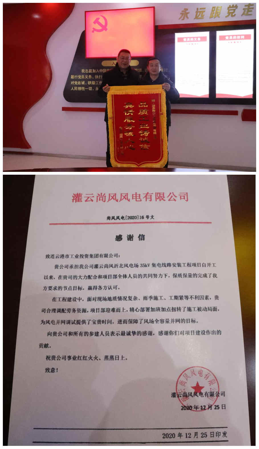 1月28日上午,灌云尚风风电有限公司副总经理王现奇一行来到公司,授予我司一面锦旗和一封《感谢信》,以感谢半年来我司在灌云尚风沂北风电场35kV集电线路安装工程项目中做出的贡献。