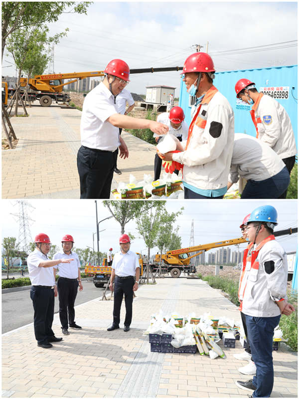 7月28日上午,云开平台公司党委副书记戴鸿鸣、工会主席刘承志一行,深入公司施工一线走访慰问职工,把绿豆、牛奶等防暑降温用品送到他们手中,在炎炎夏日,为一线职工送去云开平台公司的深切关怀。 在台北工地,戴书记与施工人员亲切交谈,简要了解了工程的施工情况,叮嘱他们在夏日高温期间要注意安全,做好防暑降温措施,确保安全生产和身体健康。(电宣)