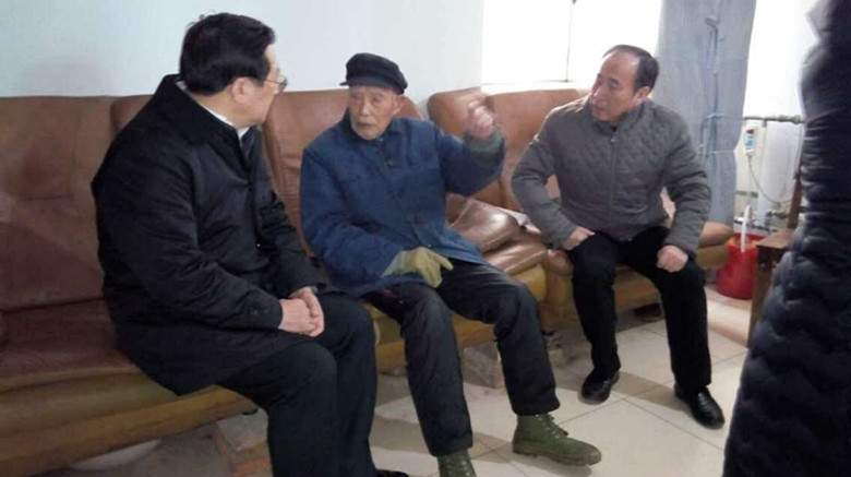 1 1月20日上午,省总工会副主席曹海(右一)、市总工会主席李强(左一)一行来到公司全国劳模、百岁老人郑有根家中走访慰问,不仅带去了慰问品和慰问金,也带去了党委、政府以及工会组织的问候和温暖。云开平台公司工会副主席李岚琴、公司党委书记、经理孙政权等陪同慰问。(司宣 司工)