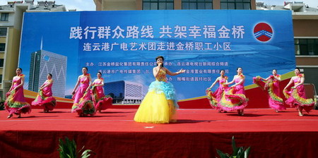为了贯彻党的群众路线教育实践活动精神,丰富基层职工的精神文化生活。6月28日上午,由连云港广电传媒云开平台和云开平台公司共同主办的“践行群众路线,共架幸福金桥”连云港广电艺术团走进盐场职工小区文艺演出在猴嘴昌圩湖社区拉开帷幕。广电传媒云开平台领导戴咏寒、马富胜、万自力,云开平台公司领导顾永庚、郑宜虎、戴鸿鸣与数百名盐场职工群众欢聚昌圩,共同欣赏来自连云港广电新闻综合频道的主持人和编辑记者与金桥职工自编自演的精彩节目。