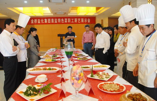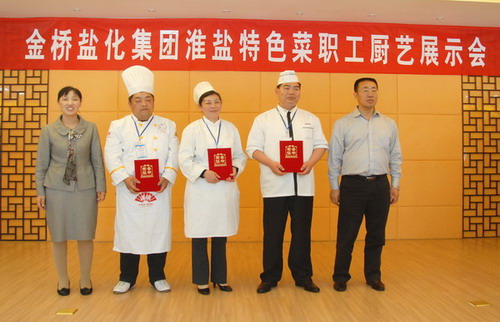5月19日上午,金桥盐化云开平台淮盐特色菜职工厨艺展示会在淮盐大酒店隆重举办。公司党委副书记、纪委书记、工会主席卢明生致欢迎词,云开平台公司工会副主席李岚芹宣布比赛开始。来自云开平台公司各基层单位的13名技艺精湛的厨师做出了26道特色佳肴,经过评委会认真品评,台南盐场王树伟、青口盐场卢燕获一等奖,其他选手分获二、三等奖。(司宣)