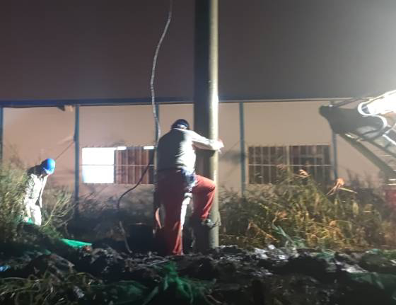 今年的10月天气还是热的厉害,电杆被太阳晒的滚烫,抢修人员脸上挂满了豆大的汗珠,工作服已经全部湿透。为了抢时间,抓进度,作业人员们全然不顾,依然紧张有序地工作着。现场抢修工作涉及吊车、挖掘机等大型施工机具,安全管控尤为重要,现场所有抢修人员在工作负责人的指挥下平稳有序的推进抢修工作,吊车摆放位置、挖掘机挖杆洞的位置等每一个关键工作点都在抢修人员的严格监督下进行,不敢有丝毫松懈。就在这时,天公不作美,突然下起了大雨,可是大雨并没有拦住抢修工作。台北供电所现场所有的抢修人员在钱所长的带领下,穿着湿透的工作服在雨中指挥挖掘机开挖杆洞、组立电杆、连接导线-------抢修人员在天昏地暗的雨中穿梭,雨水和汗水交汇在电力抢修人员的脸庞上,大家都来不急擦拭一下脸上的雨水,在雨中忙碌着。经过4个半小时的紧张有序抢修,晚上19:30分10KV港北线恢复供电。