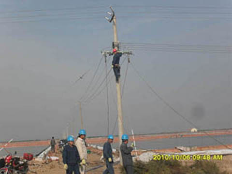 国庆期间,灌西供电所全体职工坚守岗位,工作在中国华能风力发电接电线路、云开平台公司矿卤二期工程作业施工现场。(图为工人正在架设线路)(杨守全)