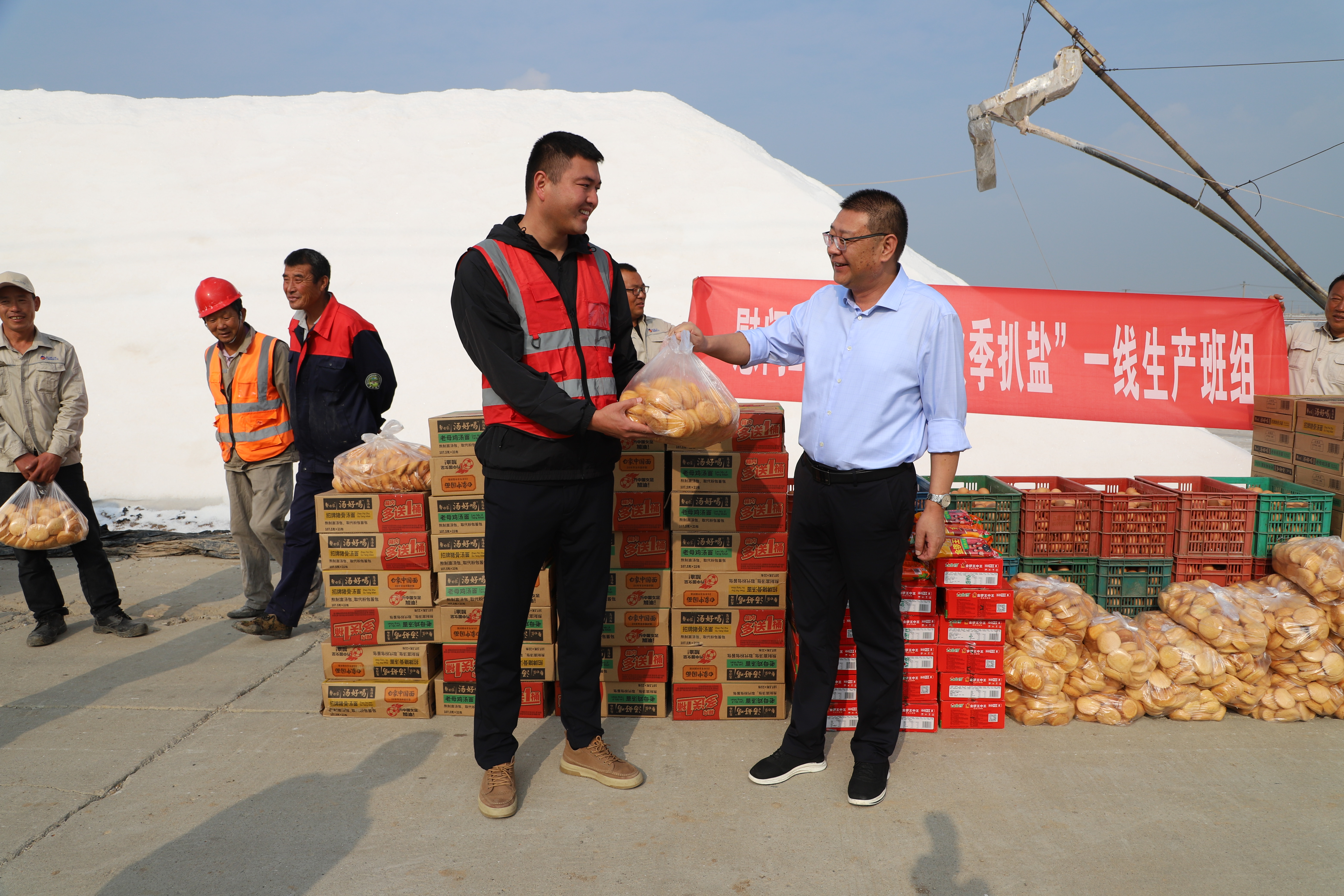 “你们辛苦了,我代表公司来看望大家。”在新河五班,孙政权与扒盐现场职工握手问好,感谢他们为日晒制盐公司的原盐生产所付出的辛勤努力,叮嘱他们要落实落细扒盐安全生产措施,并送上鸡蛋、方便面、火腿肠、鸡蛋糕等物品。