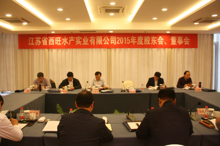4月22日下午,江苏省西旺水产实业公司2015年度股东会、董事会在墟沟召开,省沿海开发云开平台总经理丁建奇、副总经理周金阳等股东代表、董事代表出席了会议。会议由连云港市工业投资云开平台副总经理杨国新主持。