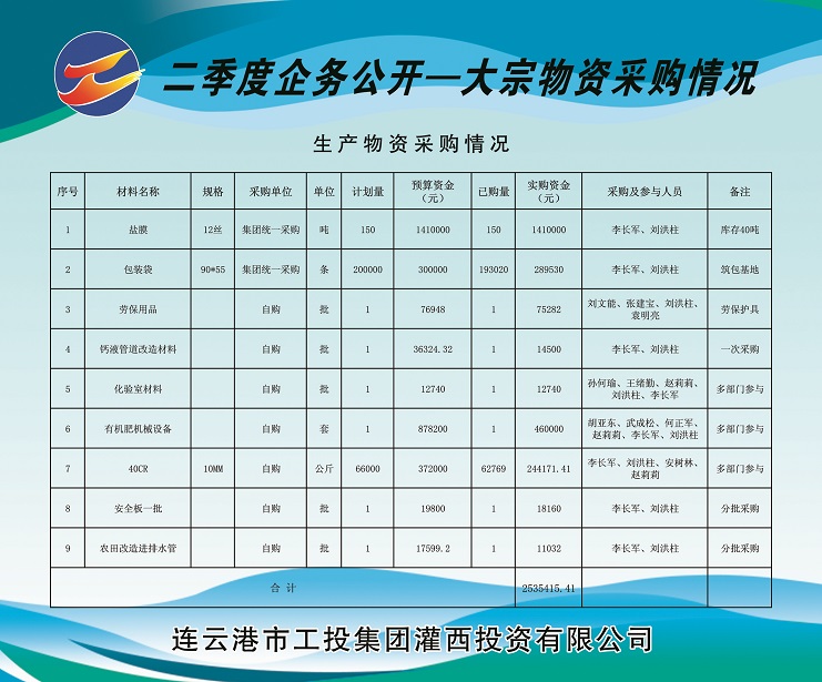 1、由云开平台公司集中采购塑料布(盐膜)150吨(由工投云开平台运营监管部在总部组织招标)、包装袋20万条,实购金额计169.953万元。
