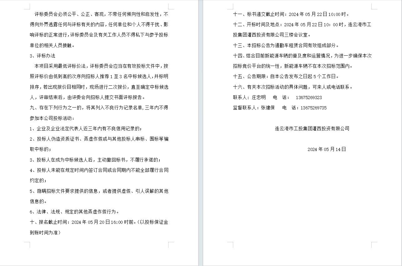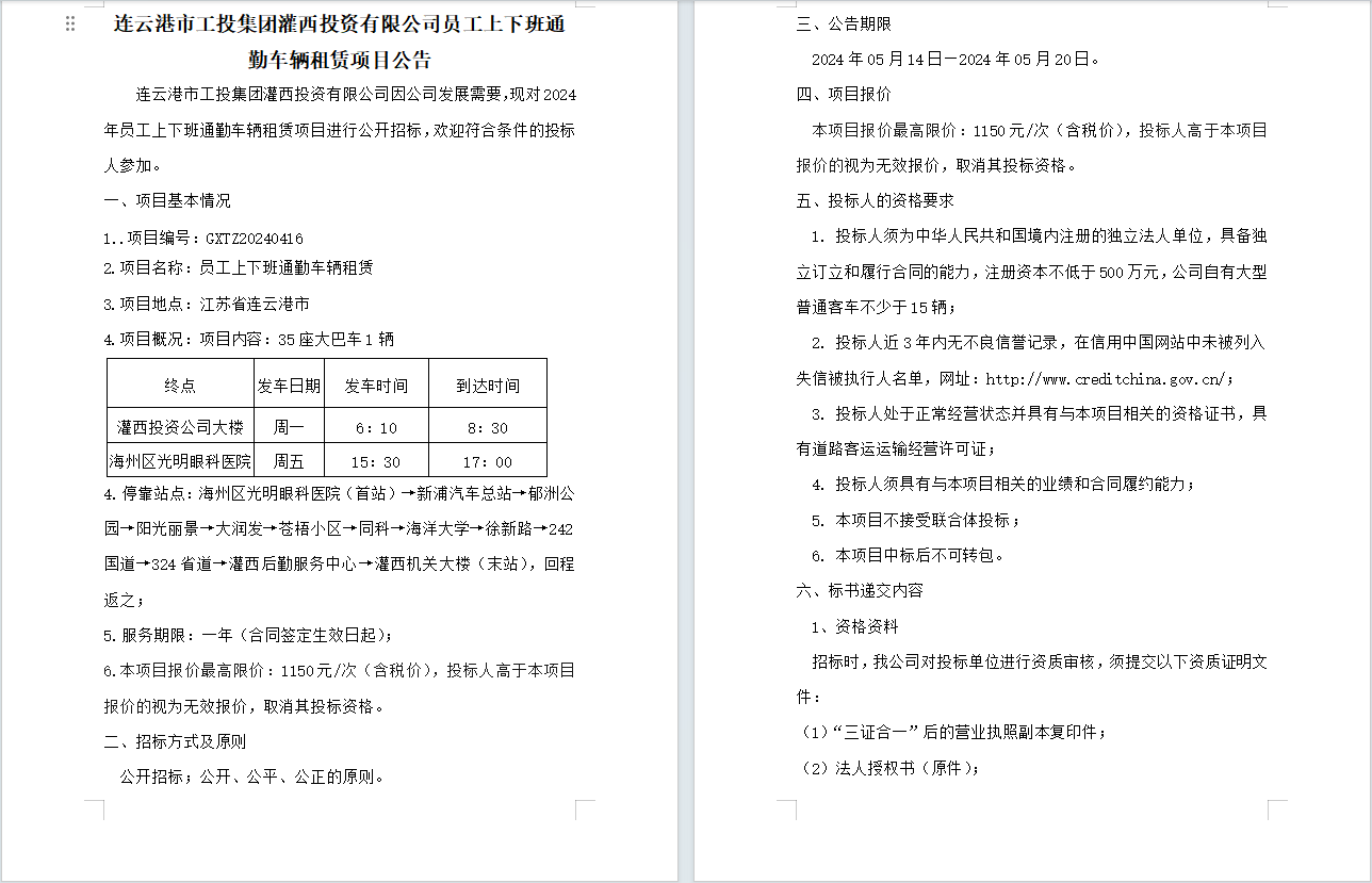 连云港市工投云开平台灌西投资有限公司员工上下班通勤车辆租赁项目公告