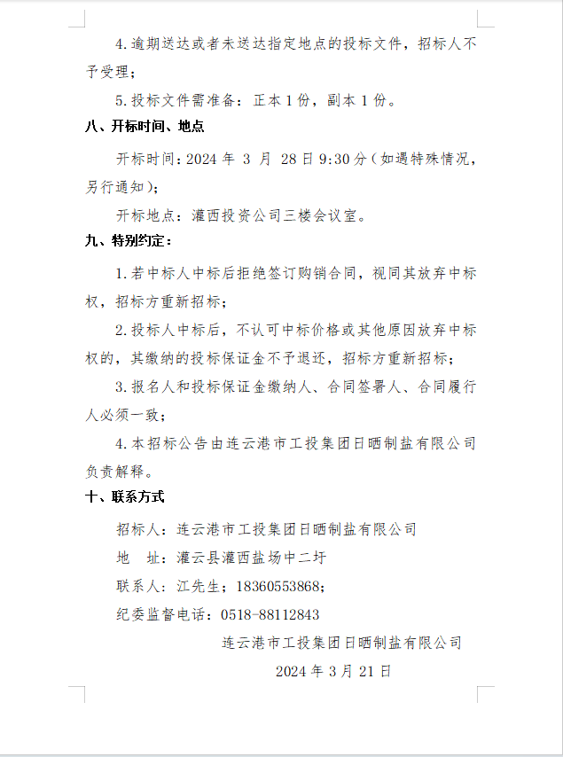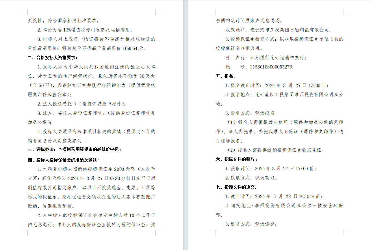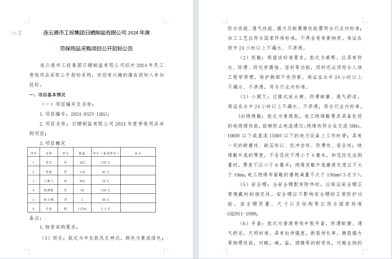 连云港市工投云开平台日晒制盐有限公司2024年度劳保用品采购项目公开招标公告