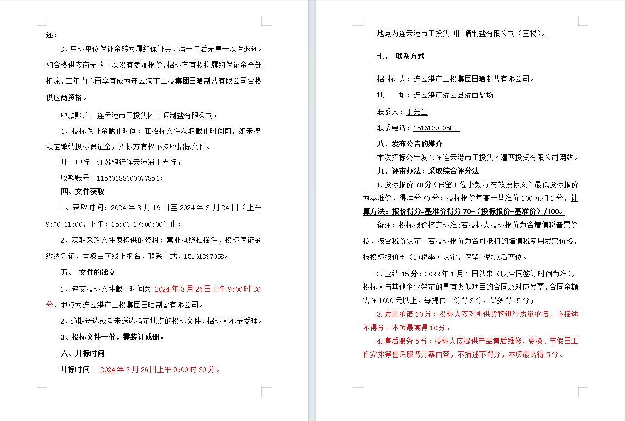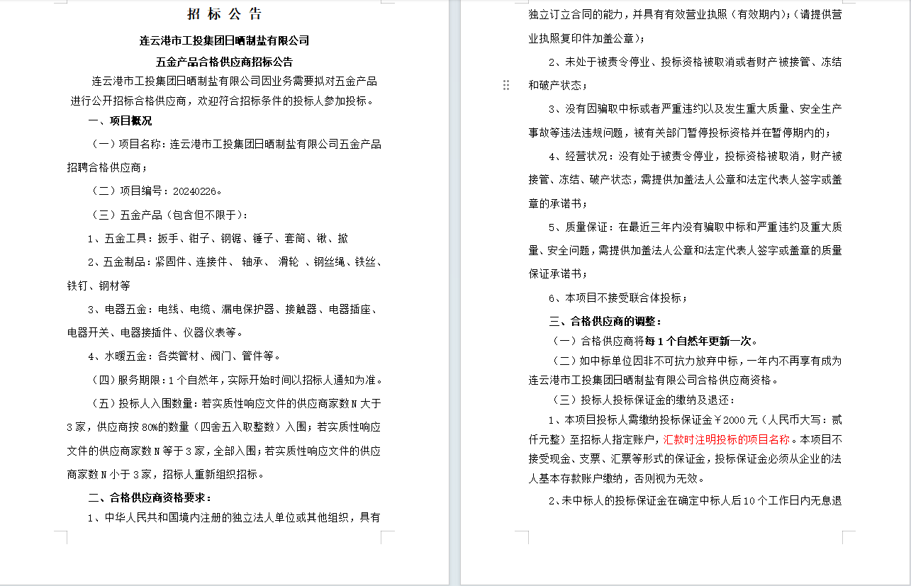 连云港市工投云开平台日晒制盐有限公司五金产品合格供应商招标公告