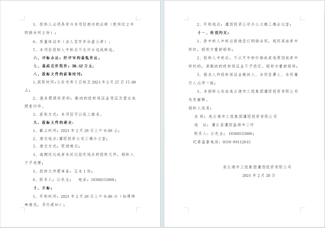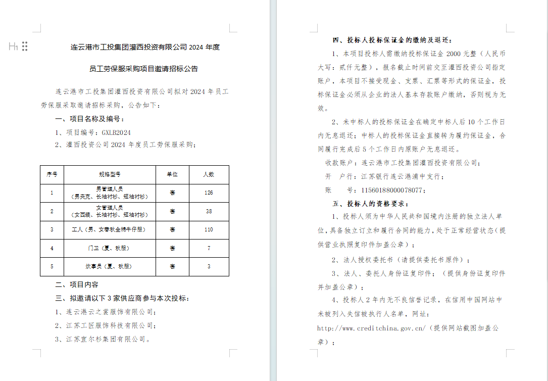 连云港市工投云开平台灌西投资有限公司2024年度员工劳保服采购项目邀请招标公告