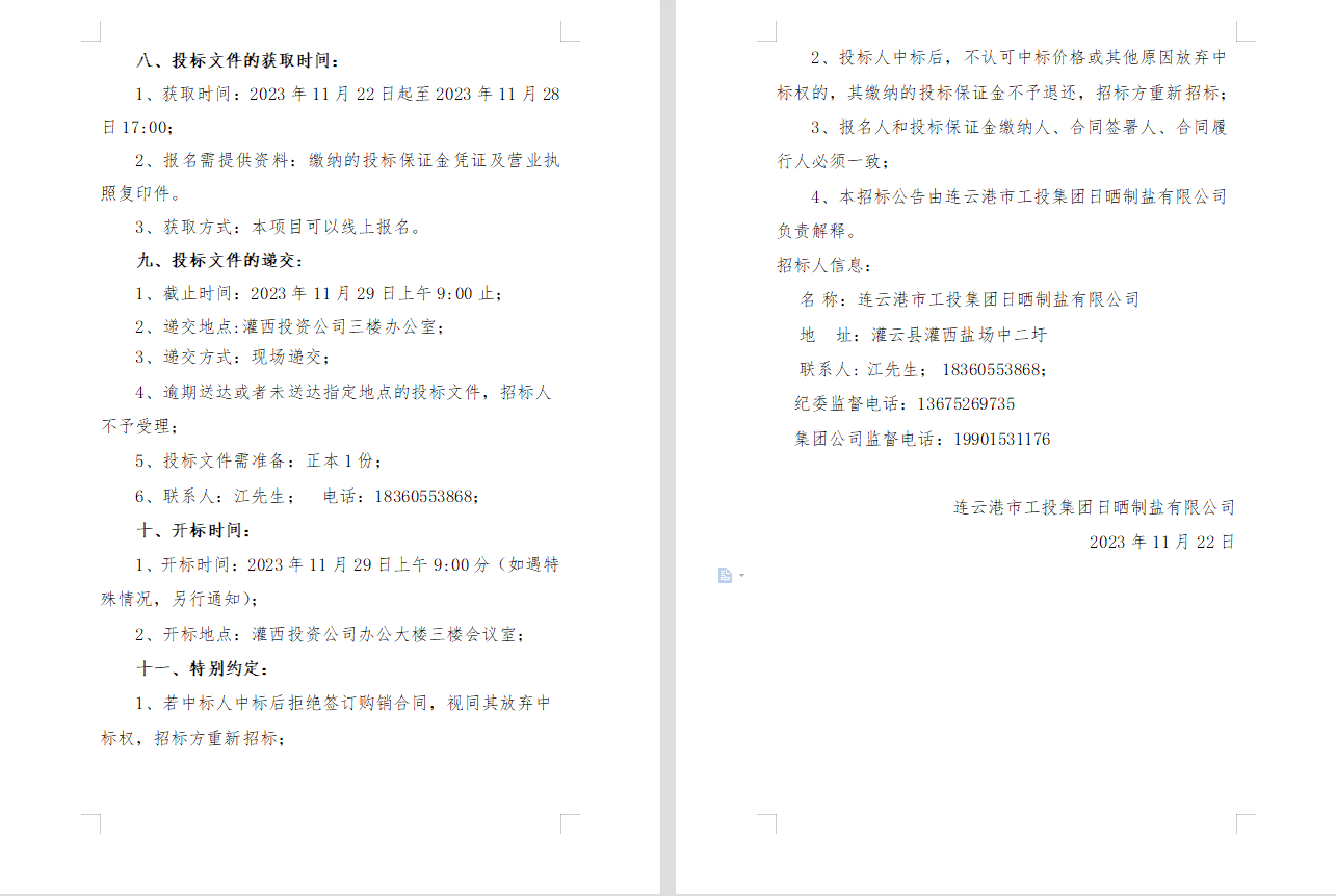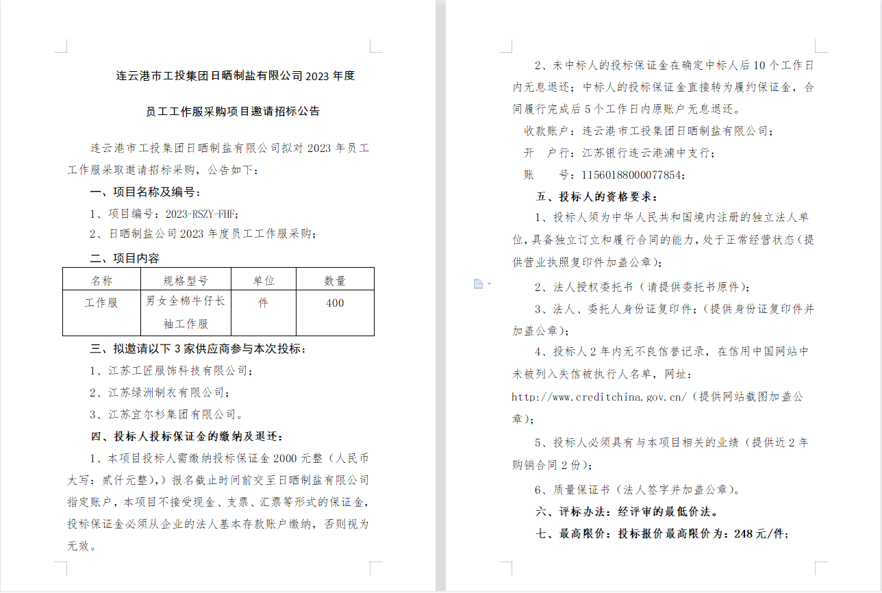 连云港市工投云开平台日晒制盐有限公司2023年度员工工作服采购项目邀请招标公告