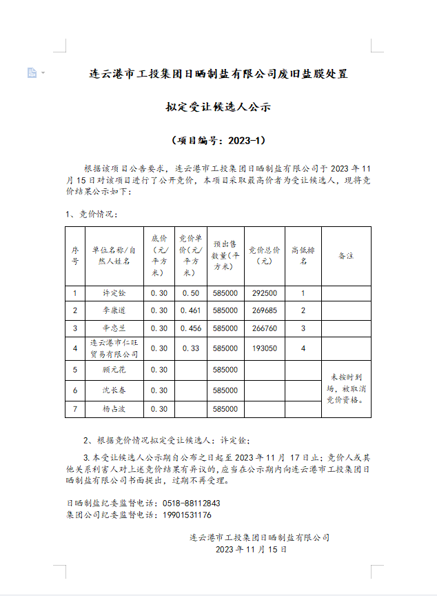 连云港市工投云开平台日晒制盐有限公司废旧盐膜处置拟定受让候选人公示