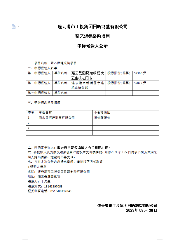连云港市工投云开平台日晒制盐有限公司聚乙烯绳采购项目中标候选人公示