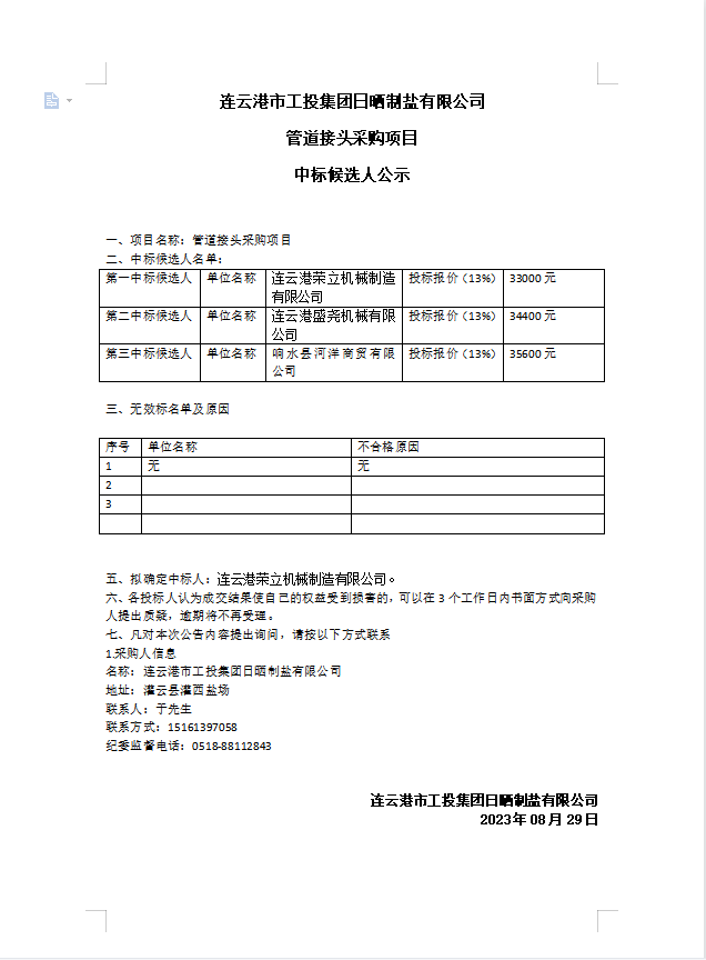 连云港市工投云开平台日晒制盐有限公司 管道接头采购项目中标候选人公示