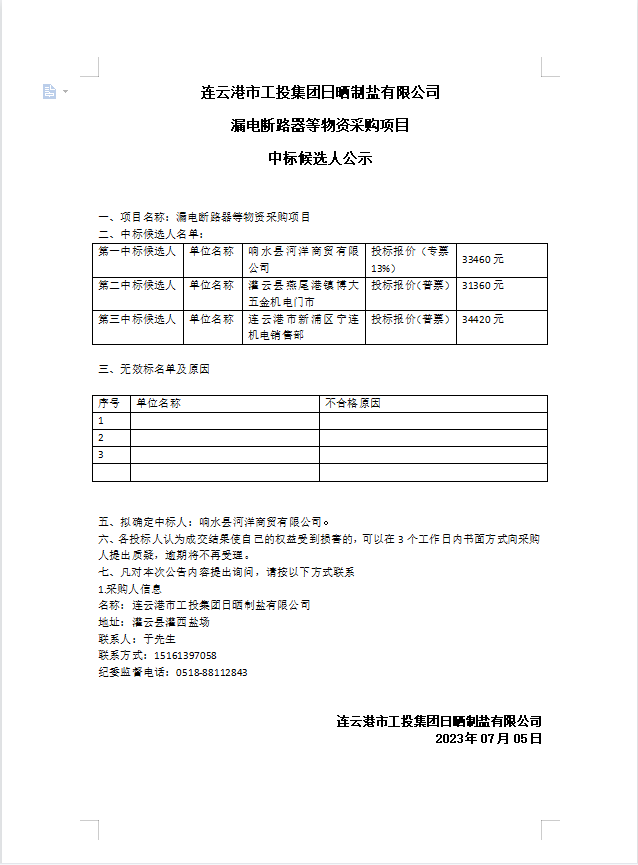连云港市工投云开平台日晒制盐有限公司漏电断路器等物资采购项目中标候选人公示