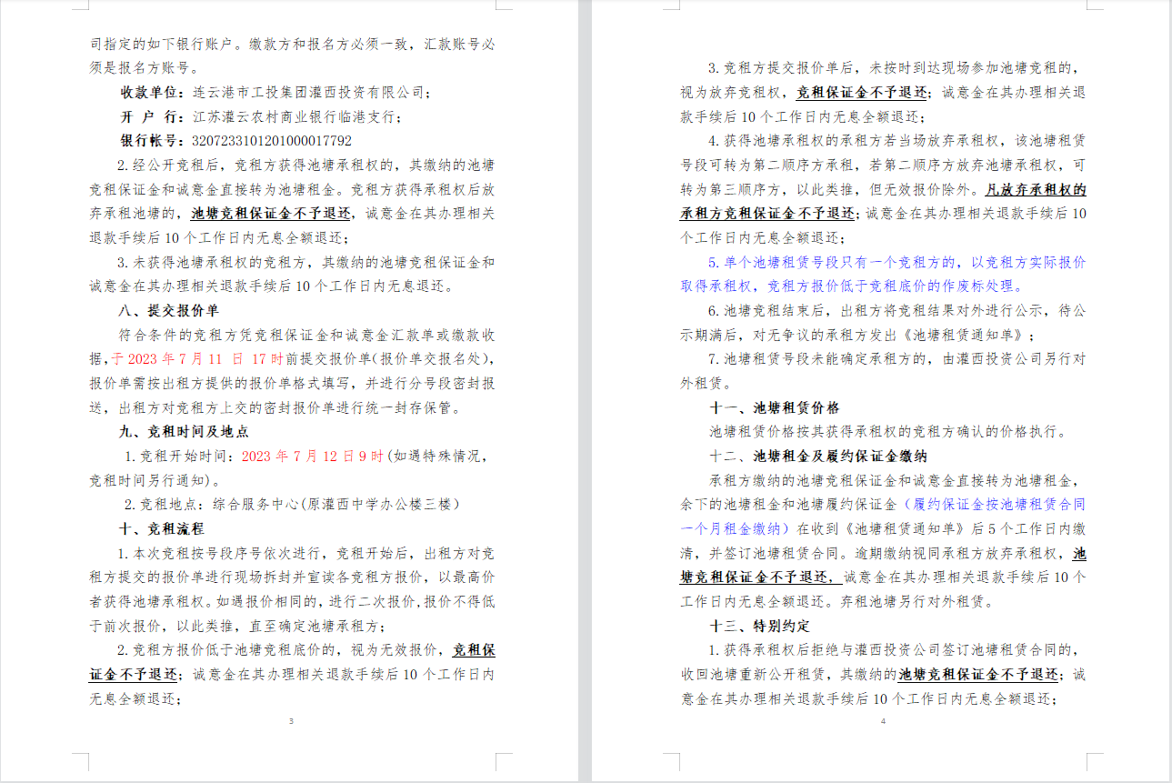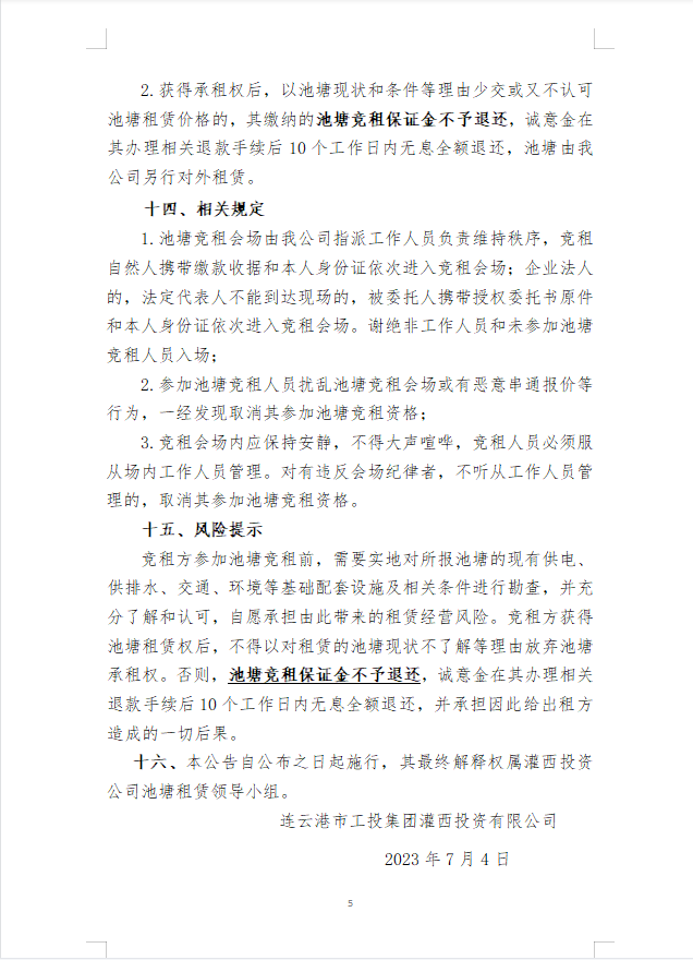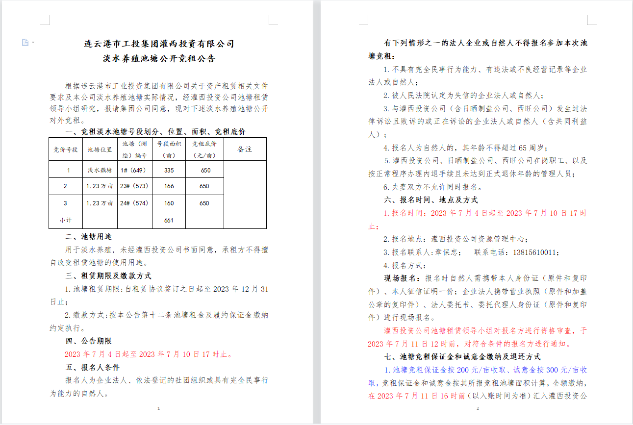 连云港市工投云开平台灌西投资有限公司淡水养殖池塘公开竞租公告