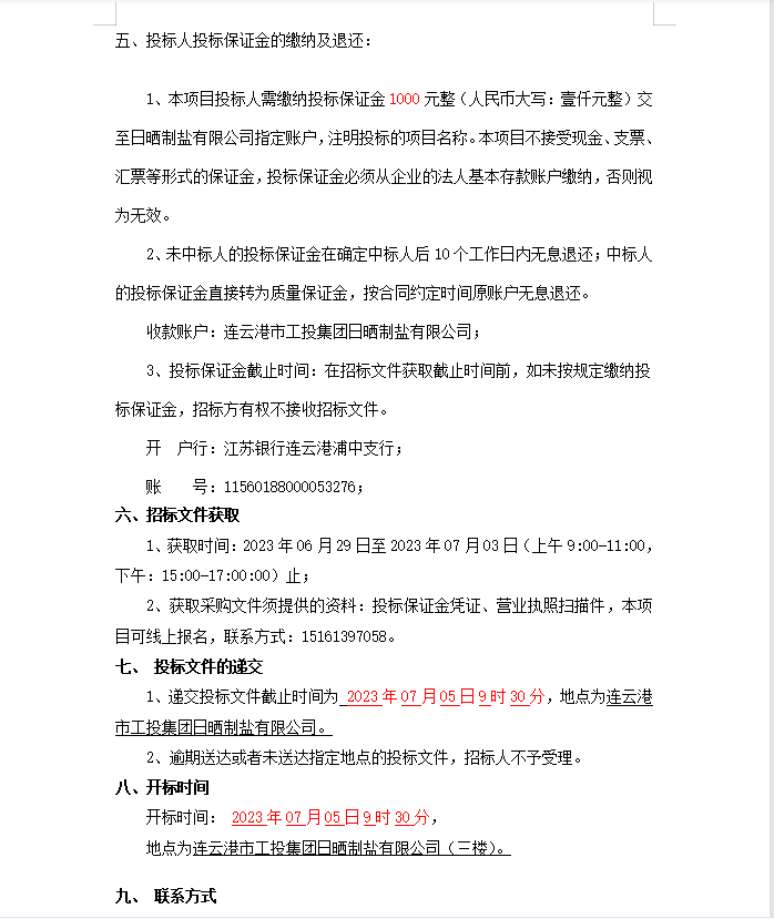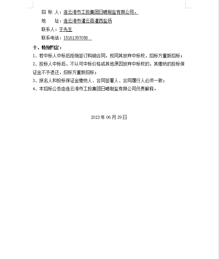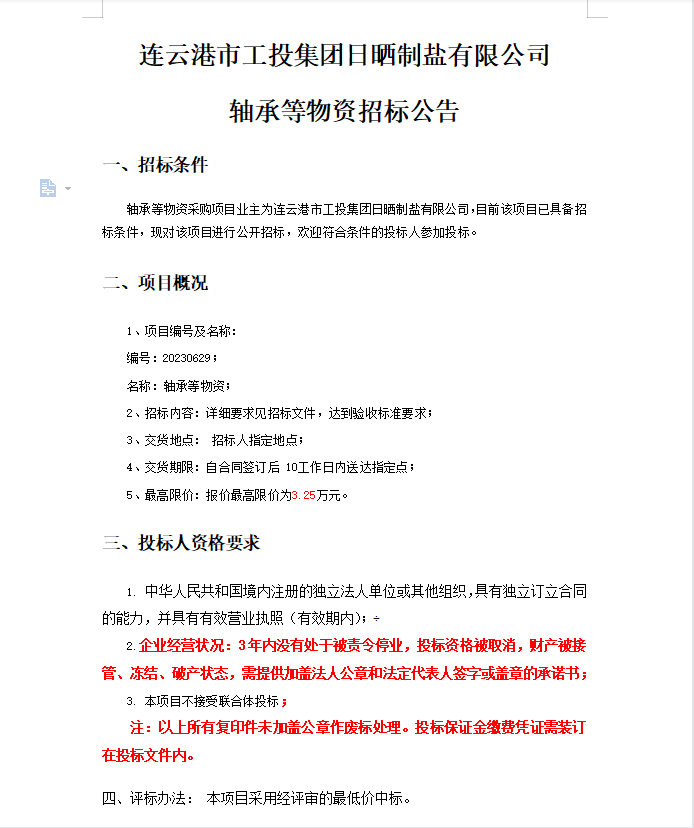 连云港市工投云开平台日晒制盐有限公司轴承等物资招标公告