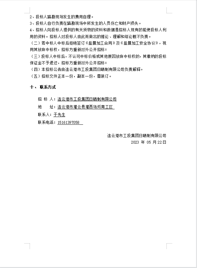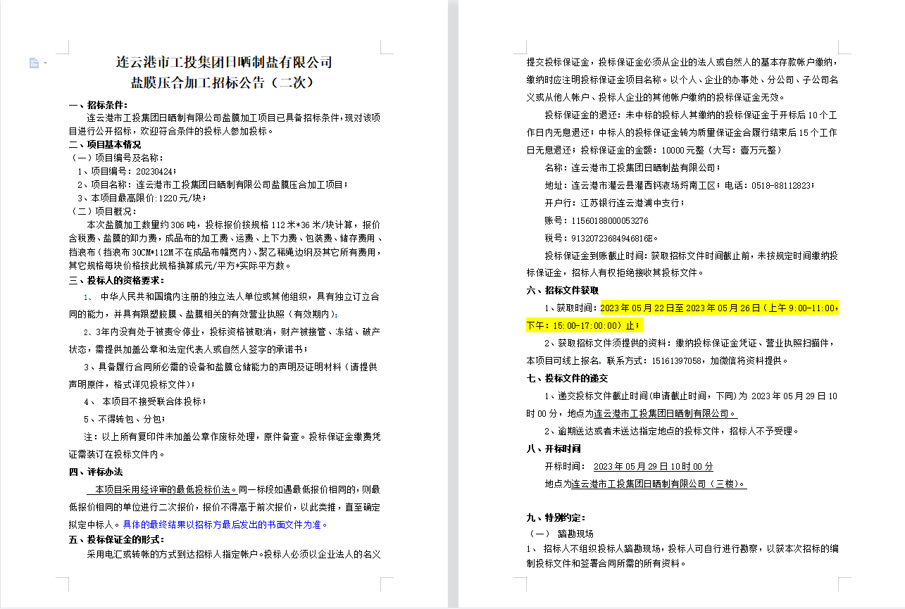连云港市工投云开平台日晒制盐有限公司盐膜压合加工招标公告(二次)