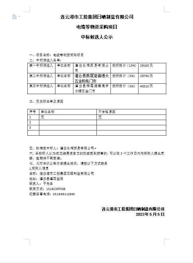 连云港市工投云开平台日晒制盐有限公司电缆等物资采购项目中标候选人公示