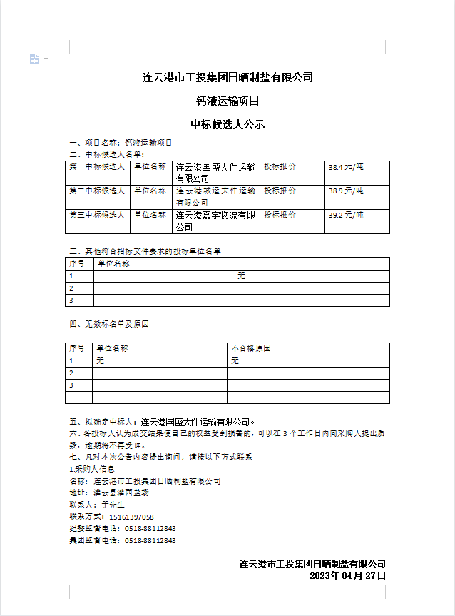 连云港市工投云开平台日晒制盐有限公司钙液运输项目中标候选人公示