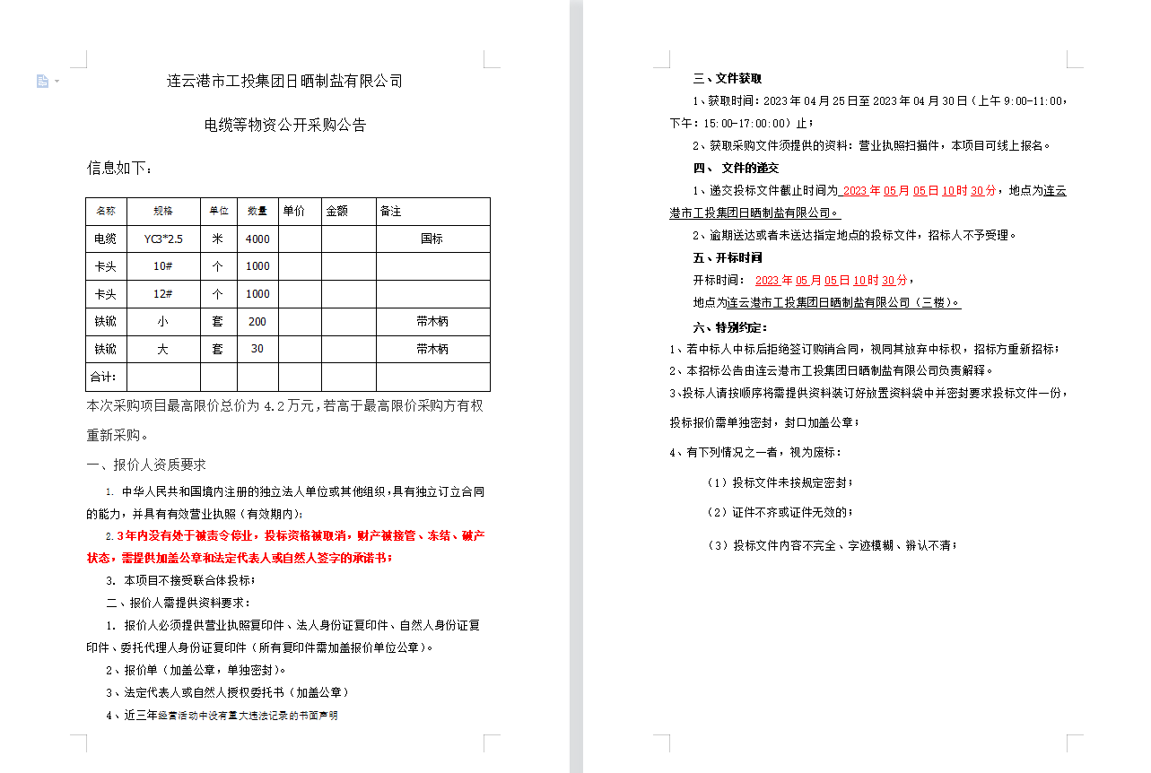 连云港市工投云开平台日晒制盐有限公司电缆等物资公开采购公告
