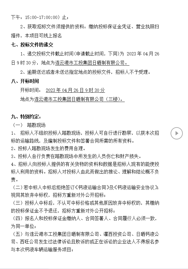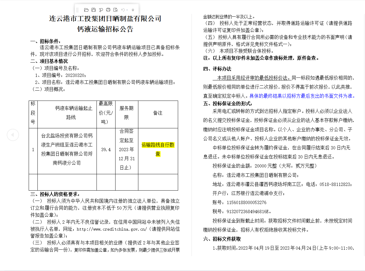 连云港市工投云开平台日晒制盐有限公司钙液运输招标公告