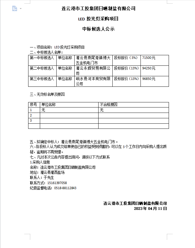 连云港市工投云开平台日晒制盐有限公司LED投光灯采购项目中标候选人公示