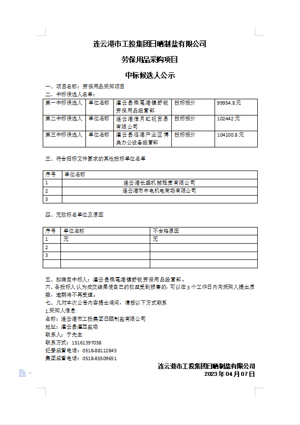 连云港市工投云开平台日晒制盐有限公司劳保用品采购项目