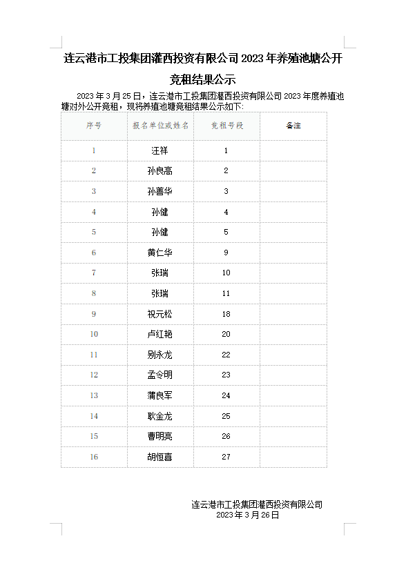 连云港市工投云开平台灌西投资有限公司2023年养殖池塘公开竞租结果公示