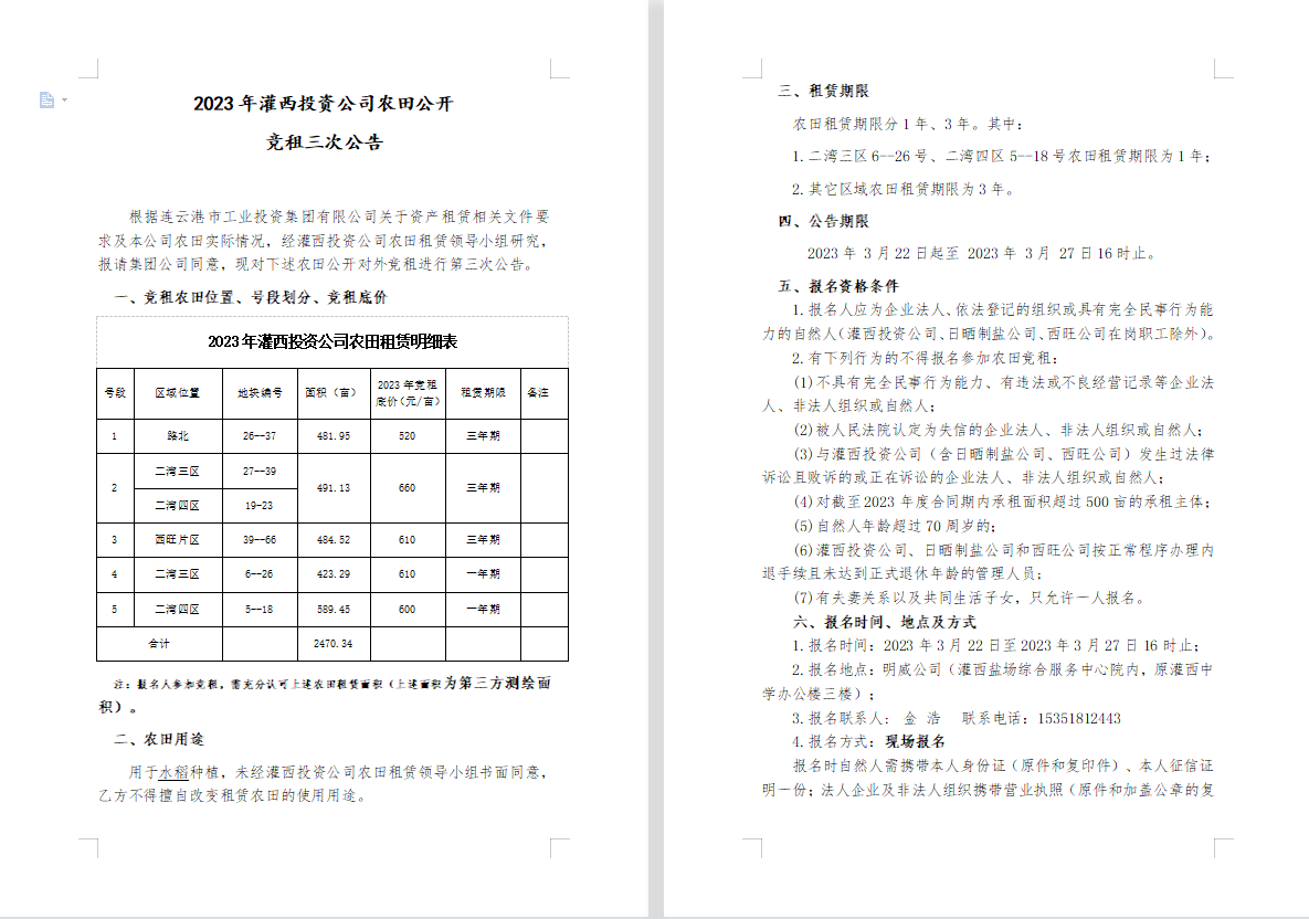 2023年灌西投资公司农田公开竞租三次公告