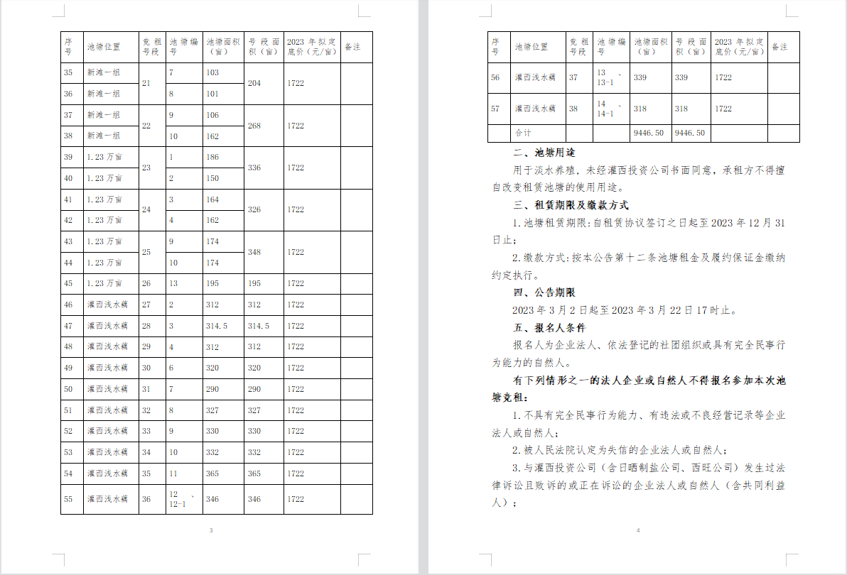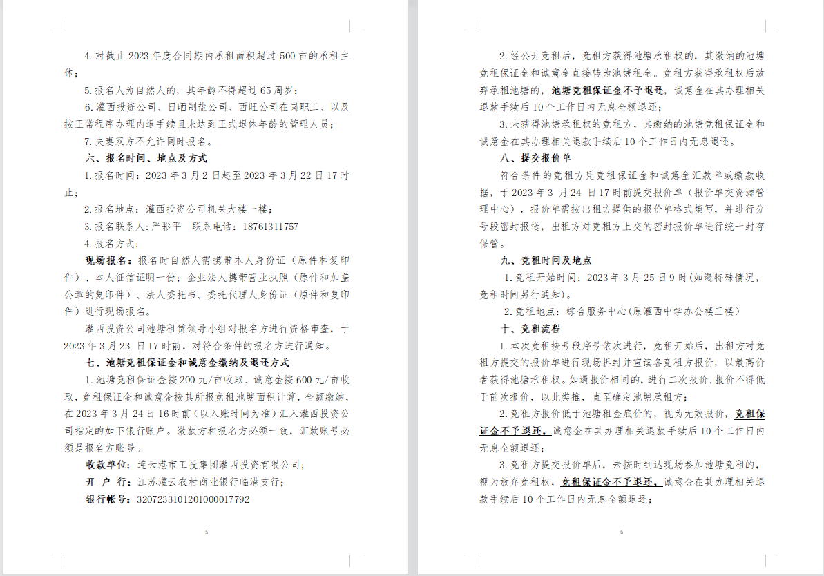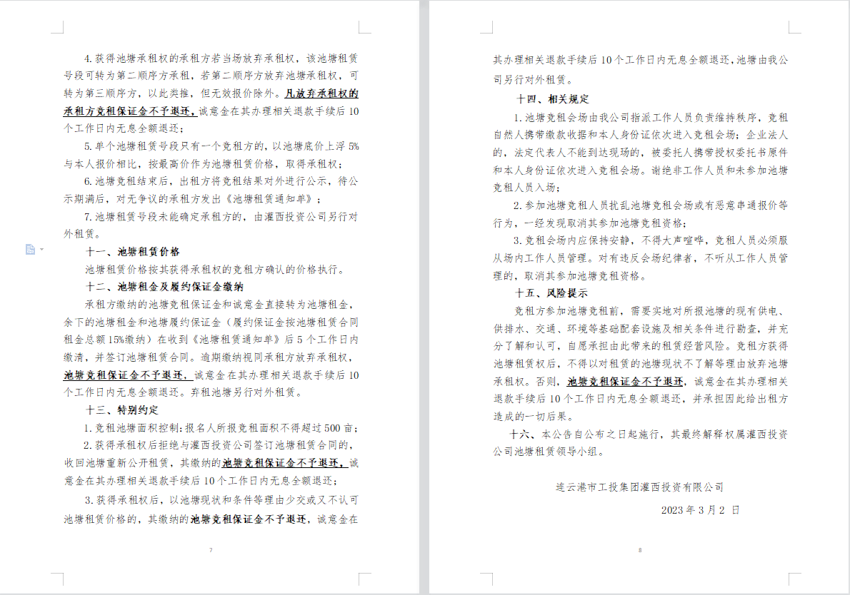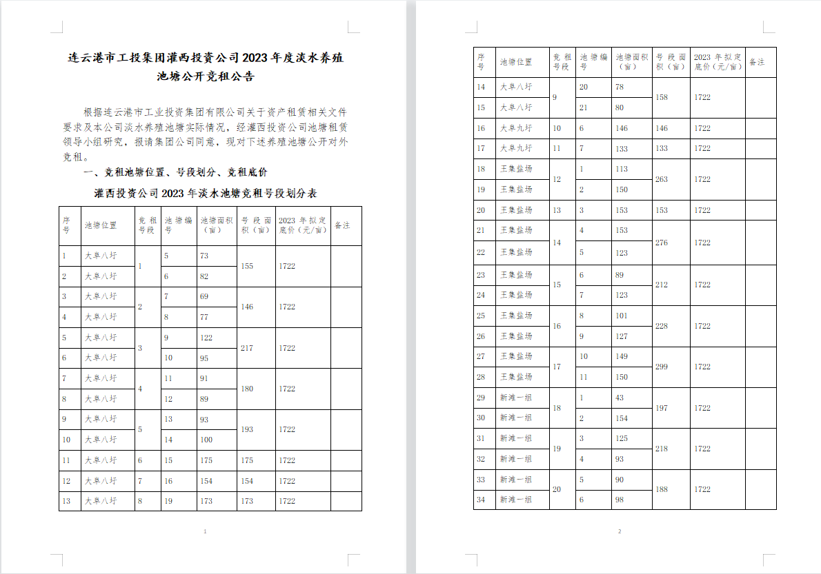 连云港市工投云开平台灌西投资公司2023年度淡水养殖池塘公开竞租公告