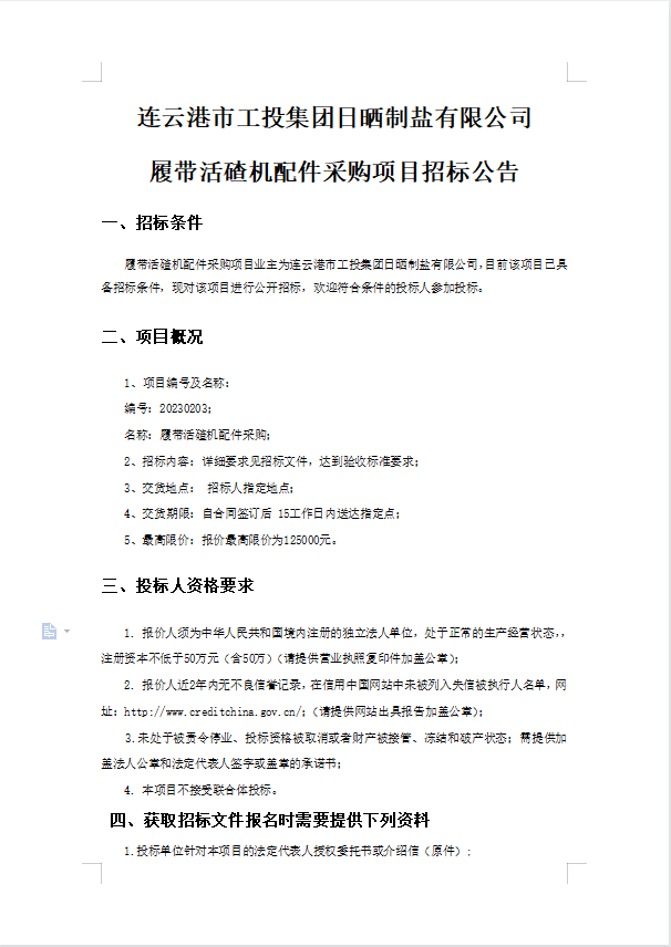 连云港市工投云开平台日晒制盐有限公司履带活碴机配件采购项目招标公告