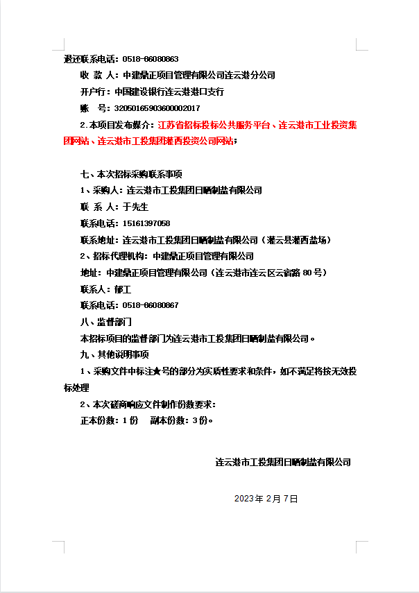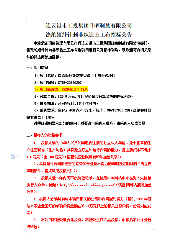 连云港市工投云开平台日晒制盐有限公司涤纶短纤针刺非织造土工布招标公告