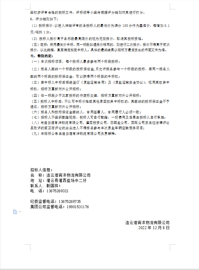 连云港宵洋物流有限公司原盐车辆运输项目招标公告