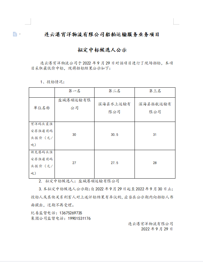 连云港宵洋物流有限公司船舶运输服务业务项目拟定中标候选人公示