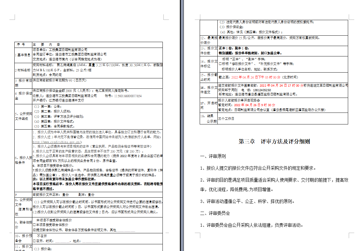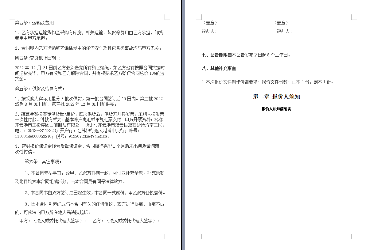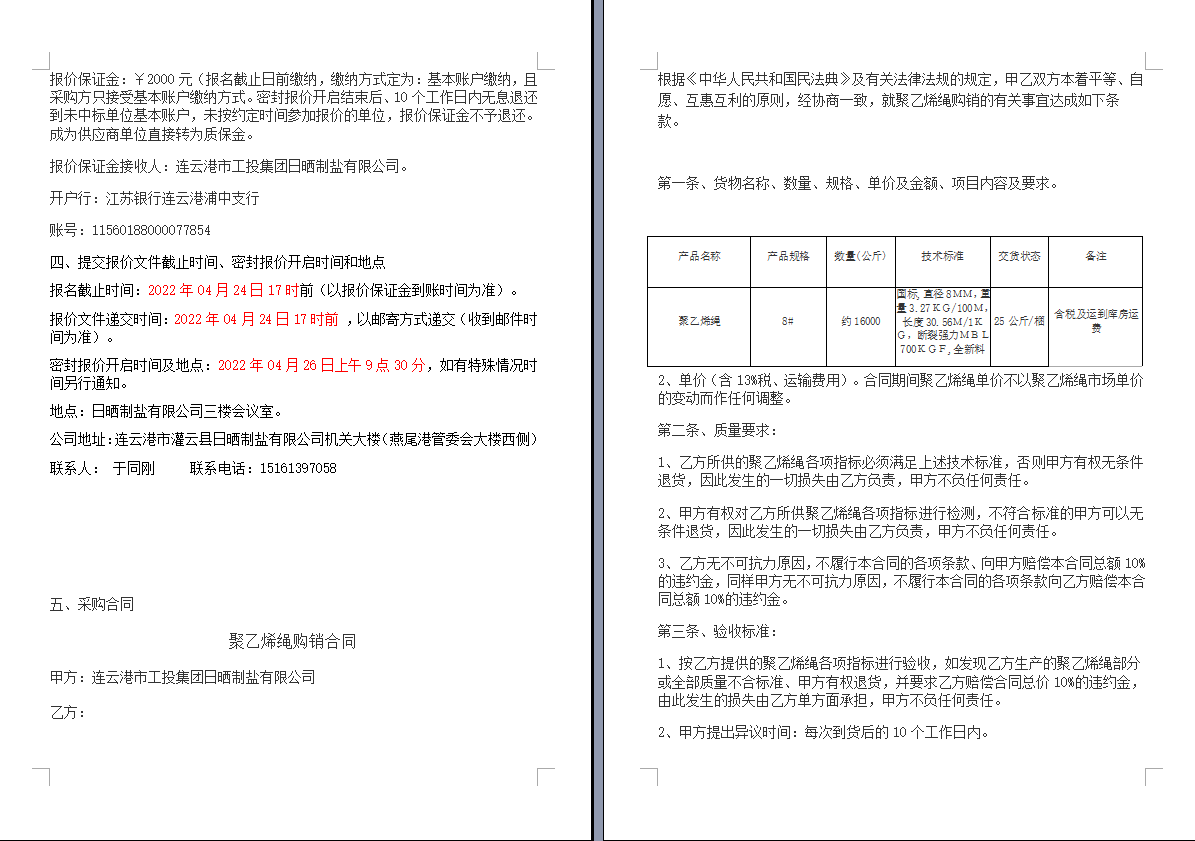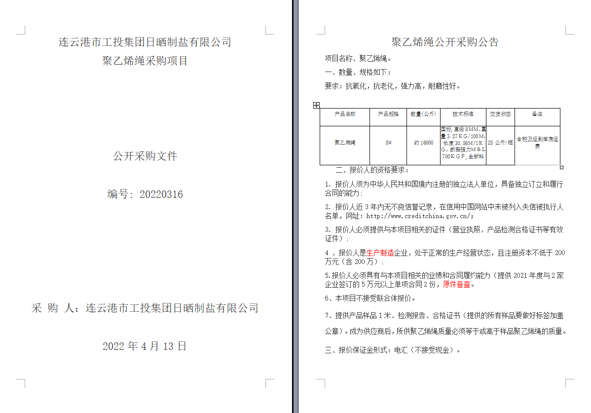 连云港市工投云开平台日晒制盐有限公司聚乙烯绳采购项目