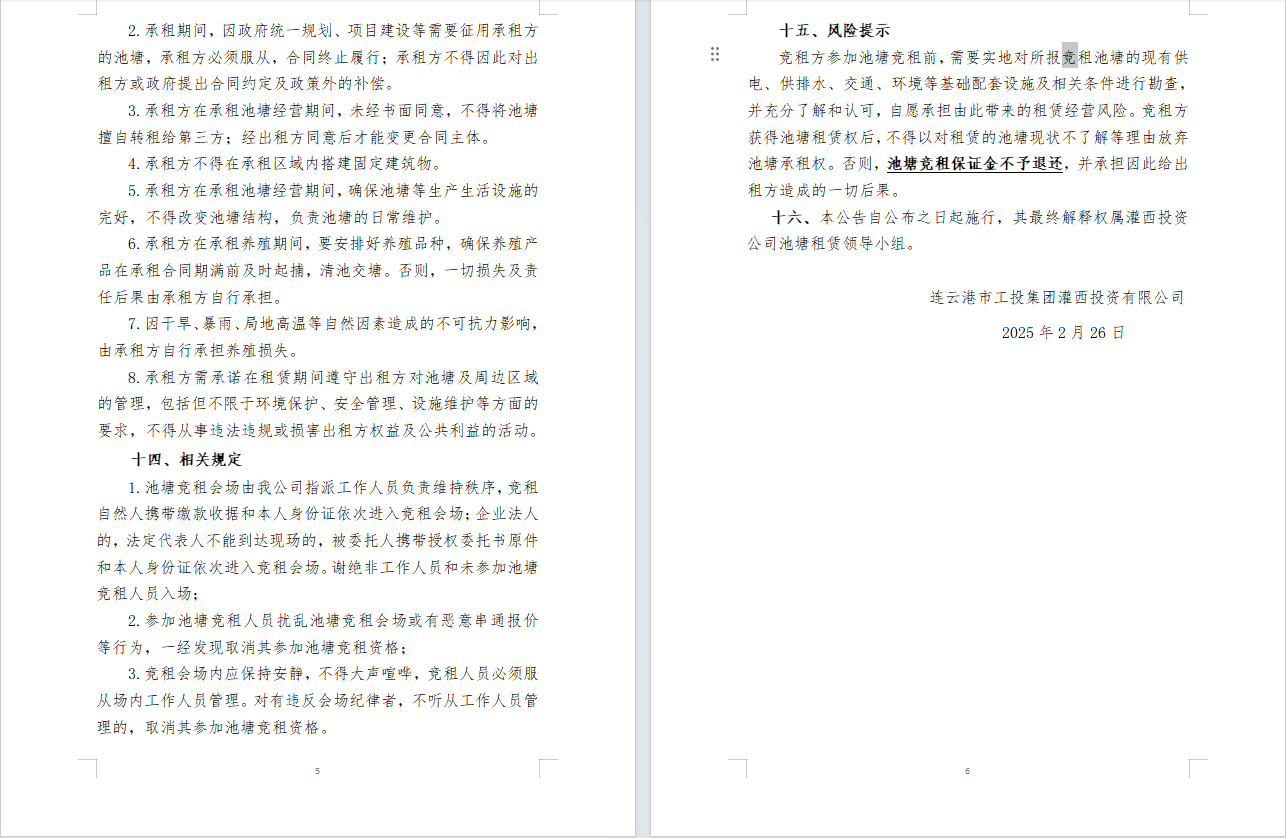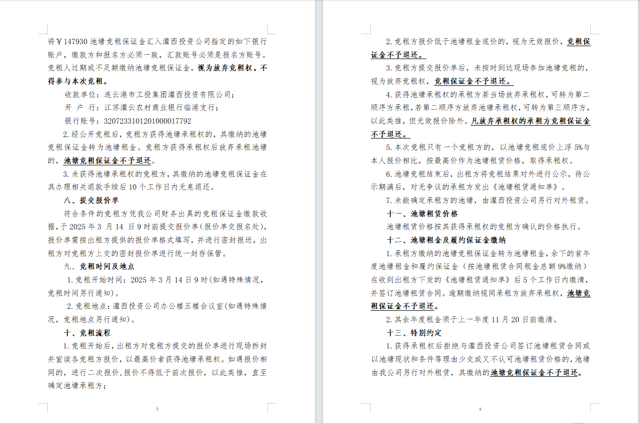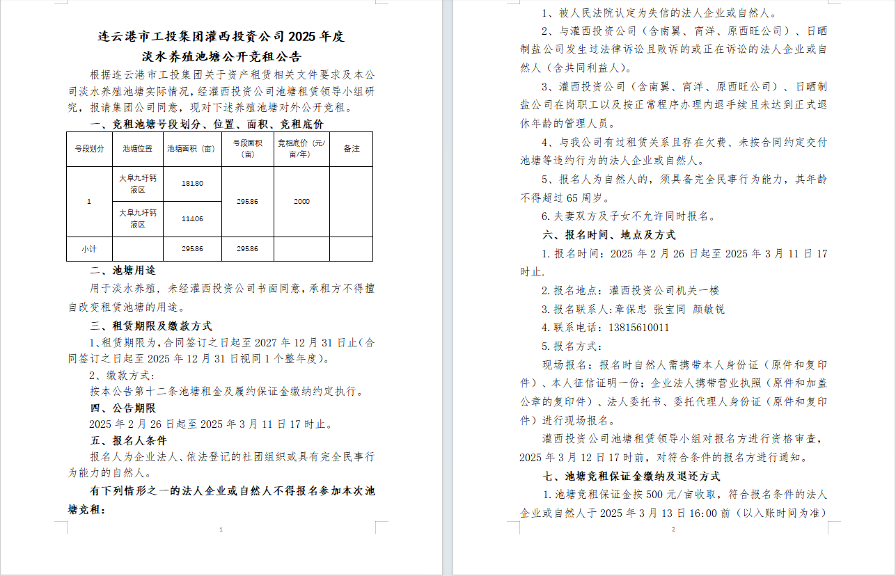 连云港市工投云开平台灌西投资公司2025年度淡水养殖池塘公开竞租公告
