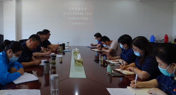会上,集体收看了《生命重于泰山》安全教育警示片,各车间汇报了二季度安全工作情况,车间负责人代表宣读《江苏金桥制盐有限公司权属单位“第一责任人”安全生产承诺书》,公司总经理助理凌家佳通报公司安全大检查情况,传达《关于深刻汲取近期事故教训采取严厉措施坚决遏制事故多发势头的通知》,公司副总经理李忠祥传达学习国家15条措施、省50条重点工作、市100条检查要点,并安排下步安全重点工作及布置2022年度防汛工作。