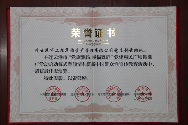 7月16日,连云港市“党旗飘扬幸福舞蹈”党建惠民广场舞推广活动启动仪式暨群众性宣传教育活动在市文化艺术中心举行。启动仪式上,来自工投云开平台资产管理公司舞蹈队登台展演,荣获市委组织部、市妇联、市文广旅局、市体育局联合颁发的“最佳表演奖”。 为了参加这次活动,公司舞蹈队12名队员进行了近一个月的辛苦排练。队员们在表演中动作精准,以零失误完成各个动作,获得观众热烈掌声和高度评赞。此次登台演出,充分展示了工投云开平台职工的精神面貌和公司舞蹈队广场舞的扎实基础。 (资产管理公司宣) |
